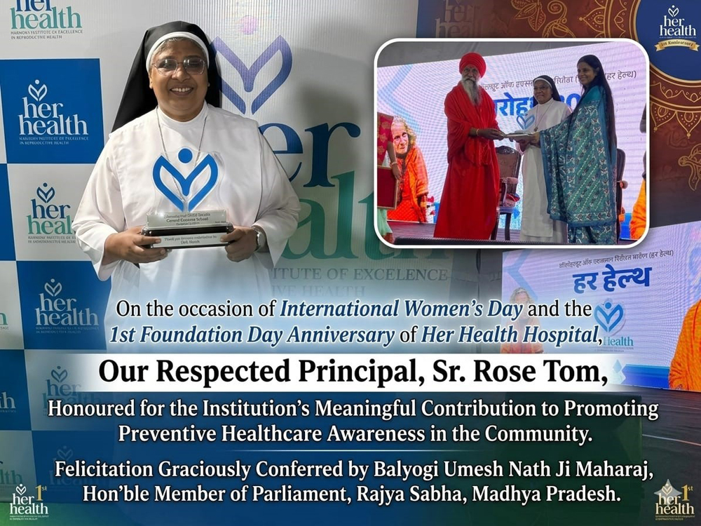Principal Rev. Sr. Rose Tom Conferred with Prestigious Honour On the momentous occasion of International Women’s Day, coinciding with the First Foundation Day Anniversary of Her Health Hospital, a formal felicitation ceremony was convened to acknowledge exemplary contributions toward social welfare and the advancement of public health awareness. It is a matter of distinct honour that our respected Principal, Sr. Rose Tom, was felicitated for the institution’s meaningful and sustained efforts in fostering preventive healthcare awareness within the community. The distinguished honour was conferred by the revered Balyogi Umesh Nath Ji Maharaj, Hon’ble Member of Parliament, Rajya Sabha, Madhya Pradesh.